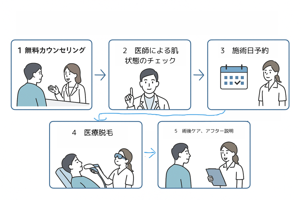 初めての方でも安心!カウンセリングから施術完了まで、全体の流れを図でまとめました。
